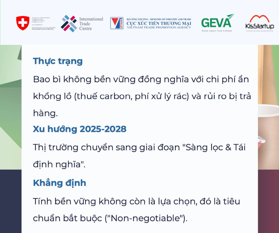 Trong khuôn khổ dự án GEVA, Workshop “Bao bì bền vững cho xuất khẩu toàn cầu” đã được tổ chức với sự đồng hành của chị Xuân Lê – Founder Xuân Lê Branding, chuyên gia trong lĩnh vực chiến lược thương hiệu và bao bì cho thị trường quốc tế.