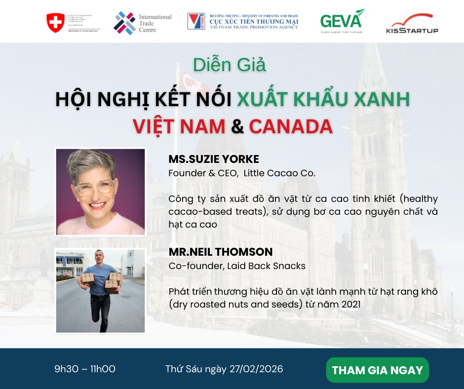 Buổi Webinar quy tụ các nhà sáng lập, CEO và chuyên gia trong hệ sinh thái thực phẩm bền vững tại Canada – những người trực tiếp làm việc với chuỗi bán lẻ, nhà đầu tư và mạng lưới nhập khẩu tại thị trường Canada & Bắc Mỹ.
