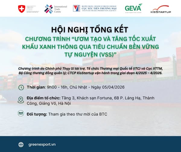 Sau 1 năm triển khai đầy nỗ lực và sáng tạo, chương trình “Ươm tạo và tăng tốc xuất khẩu xanh thông qua Tiêu Chuẩn Bền Vững Tự Nguyện (VSS)” chuẩn bị chính thức khép lại, đánh dấu bằng Hội nghị tổng kết dự án – cột mốc quan trọng nhìn lại toàn bộ hành trình và kết quả đạt được.