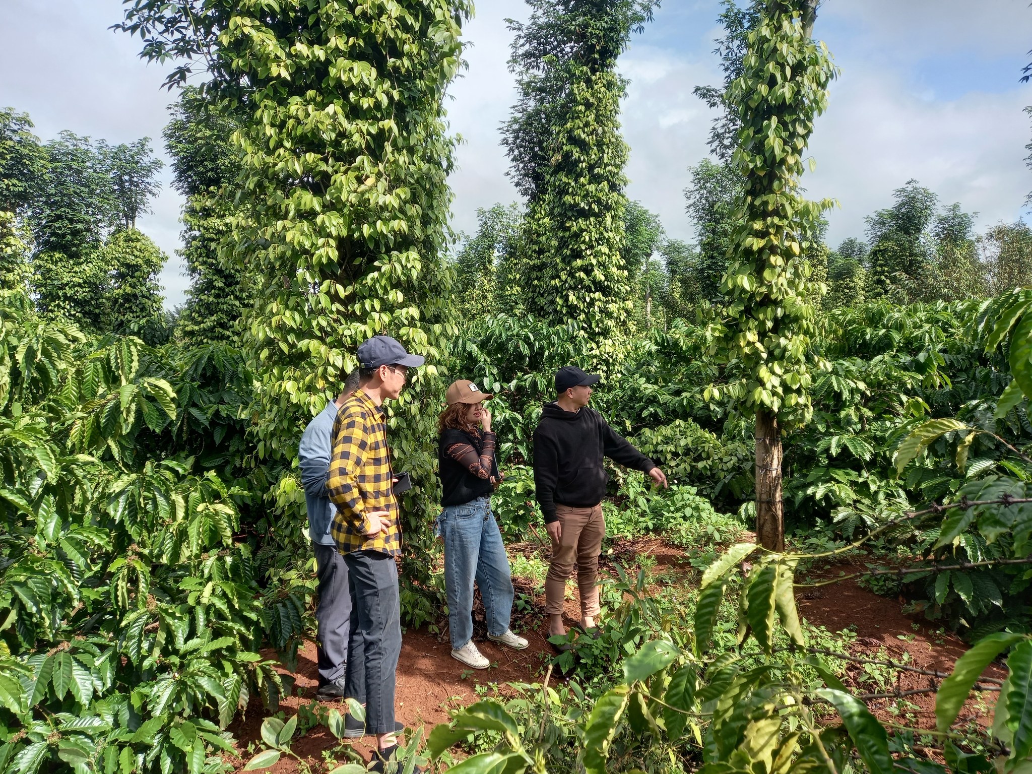 Tháng 12/2025, dự án GEVA phối hợp cùng ThS. Bùi Khánh Tùng – Phó Giám đốc Trung tâm Hỗ trợ Phát triển Nông nghiệp Hữu cơ – đã có chuyến khảo sát thực địa tại DACCO Coffee, tỉnh Đắk Lắk. DACCO hiện đang phát triển mô hình canh tác cà phê xen canh hồ tiêu và sầu riêng, với sự liên kết chặt chẽ cùng các hộ nông dân địa phương.