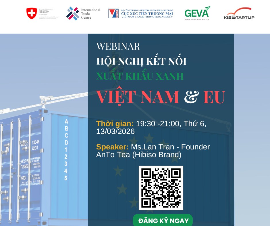 Về GEVA: Chương trình "Ươm tạo và Tăng tốc xuất khẩu xanh thông qua Tiêu chuẩn Bền vững Tự nguyện (VSS)" là dự án do Chính phủ Thụy Sĩ tài trợ, Tổ chức Thương mại Quốc tế (ITC) và Cục XTTM, Bộ Công thương đồng quản lý; CTCP KisStartup vận hành trong giai đoạn 4/2025 – 4/2026.